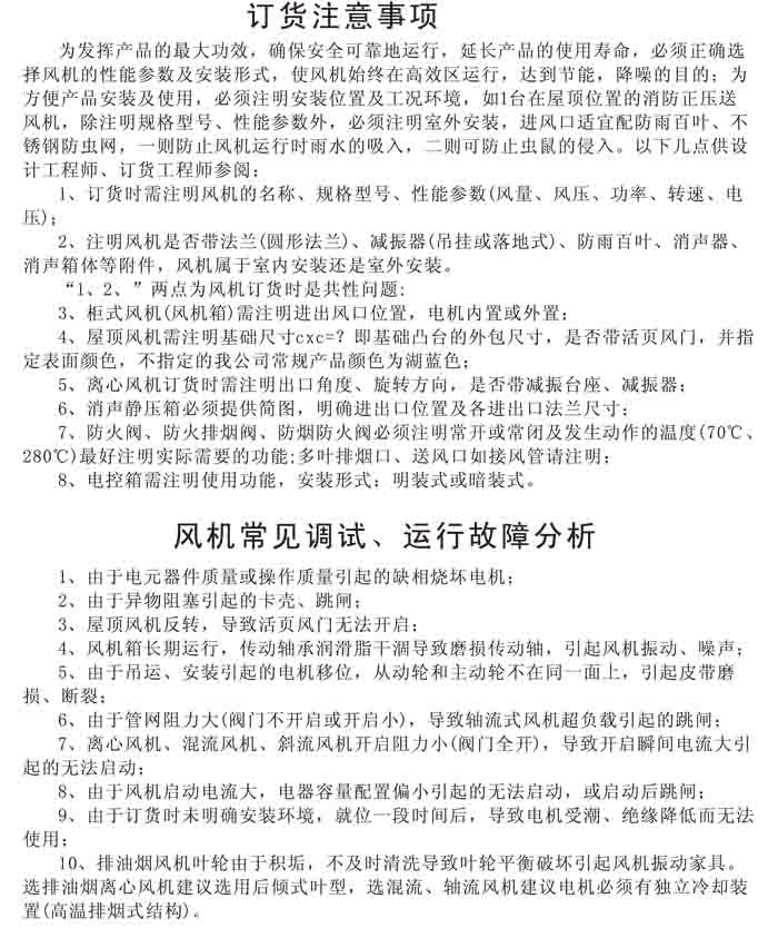 一、风机选用参考、安装维护使用说明、常见故障分析、订货注意事项